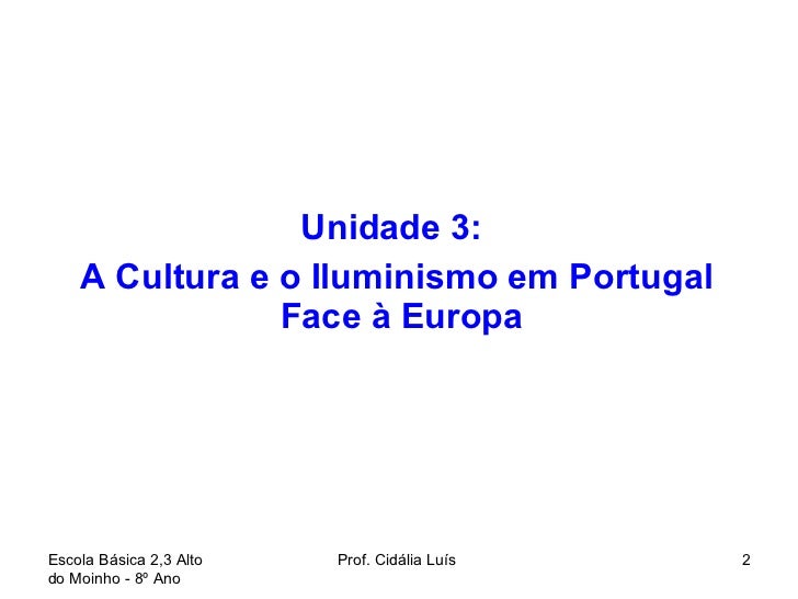 2. 2. <ul><li>Unidade 3: </li></ul><ul><li>A Cultura e o Iluminismo em Portugal Face à Europa </li></ul>Escola Básica 2,3 Alto do Moinho - 8º Ano Prof. Cidália Luís