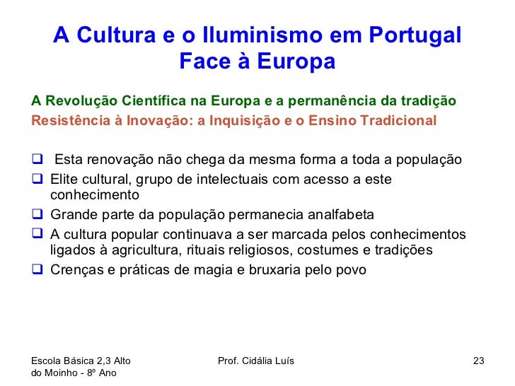 23. 23. A Cultura e o Iluminismo em Portugal Face à Europa <ul><li>A Revolução Científica na Europa e a permanência da tradição </li></ul><ul><li>Resistência à Inovação: a Inquisição e o Ensino Tradicional </li></ul><ul><li>Esta renovação não chega da mesma forma a toda a população </li></ul><ul><li>Elite cultural, grupo de intelectuais com acesso a este conhecimento </li></ul><ul><li>Grande parte da população permanecia analfabeta </li></ul><ul><li>A cultura popular continuava a ser marcada pelos conhecimentos ligados à agricultura, rituais religiosos, costumes e tradições </li></ul><ul><li>Crenças e práticas de magia e bruxaria pelo povo </li></ul>Escola Básica 2,3 Alto do Moinho - 8º Ano Prof. Cidália Luís