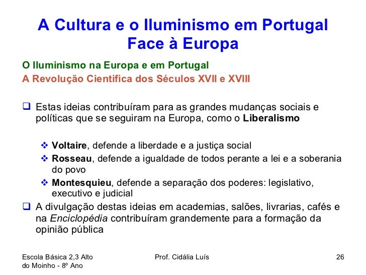 26. 26. A Cultura e o Iluminismo em Portugal Face à Europa <ul><li>O Iluminismo na Europa e em Portugal </li></ul><ul><li>A Revolução Cientifica dos Séculos XVII e XVIII </li></ul><ul><li>Estas ideias contribuíram para as grandes mudanças sociais e políticas que se seguiram na Europa, como o Liberalismo </li></ul><ul><ul><li>Voltaire , defende a liberdade e a justiça social </li></ul></ul><ul><ul><li>Rosseau , defende a igualdade de todos perante a lei e a soberania do povo </li></ul></ul><ul><ul><li>Montesquieu , defende a separação dos poderes: legislativo, executivo e judicial </li></ul></ul><ul><li>A divulgação destas ideias em academias, salões, livrarias, cafés e na Enciclopédia contribuíram grandemente para a formação da opinião pública </li></ul>Escola Básica 2,3 Alto do Moinho - 8º Ano Prof. Cidália Luís