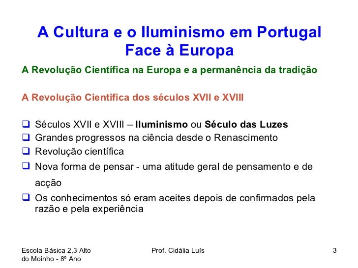 3. 3. A Cultura e o Iluminismo em Portugal Face à Europa <ul><li>A Revolução Científica na Europa e a permanência da tradição </li></ul><ul><li>A Revolução Cientifica dos séculos XVII e XVIII </li></ul><ul><li>Séculos XVII e XVIII – Iluminismo ou Século das Luzes </li></ul><ul><li>Grandes progressos na ciência desde o Renascimento </li></ul><ul><li>Revolução científica </li></ul><ul><li>Nova forma de pensar - uma atitude geral de pensamento e de acção </li></ul><ul><li>Os conhecimentos só eram aceites depois de confirmados pela razão e pela experiência </li></ul>Escola Básica 2,3 Alto do Moinho - 8º Ano Prof. Cidália Luís
