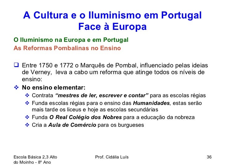 36. 36. A Cultura e o Iluminismo em Portugal Face à Europa <ul><li>O Iluminismo na Europa e em Portugal </li></ul><ul><li>As Reformas Pombalinas no Ensino </li></ul><ul><li>Entre 1750 e 1772 o Marquês de Pombal, influenciado pelas ideias de Verney, leva a cabo um reforma que atinge todos os níveis de ensino: </li></ul><ul><li>No ensino elementar: </li></ul><ul><ul><li>Contrata “mestres de ler, escrever e contar” para as escolas régias </li></ul></ul><ul><ul><li>Funda escolas régias para o ensino das Humanidades , estas serão mais tarde os liceus e hoje as escolas secundárias </li></ul></ul><ul><ul><li>Funda O Real Colégio dos Nobres para a educação da nobreza </li></ul></ul><ul><ul><li>Cria a Aula de Comércio para os burgueses </li></ul></ul>Escola Básica 2,3 Alto do Moinho - 8º Ano Prof. Cidália Luís