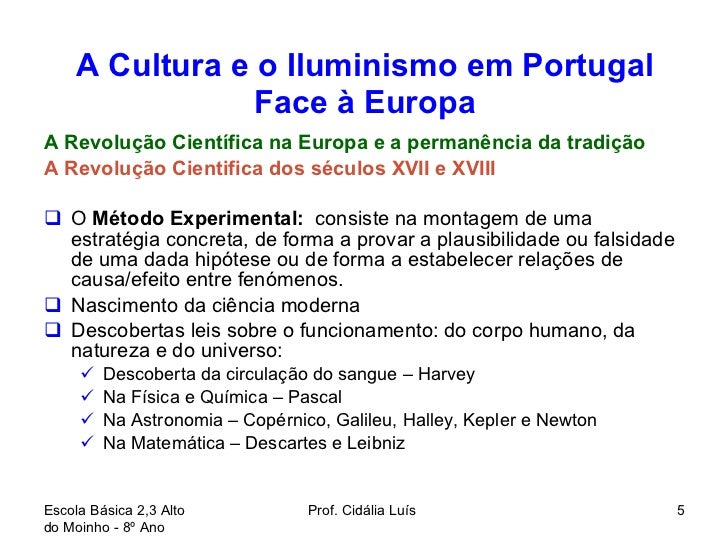 5. 5. A Cultura e o Iluminismo em Portugal Face à Europa <ul><li>A Revolução Científica na Europa e a permanência da tradição </li></ul><ul><li>A Revolução Cientifica dos séculos XVII e XVIII </li></ul><ul><li>O Método Experimental: consiste na montagem de uma estratégia concreta, de forma a provar a plausibilidade ou falsidade de uma dada hipótese ou de forma a estabelecer relações de causa/efeito entre fenómenos. </li></ul><ul><li>Nascimento da ciência moderna </li></ul><ul><li>Descobertas leis sobre o funcionamento: do corpo humano, da natureza e do universo: </li></ul><ul><ul><li>Descoberta da circulação do sangue – Harvey </li></ul></ul><ul><ul><li>Na Física e Química – Pascal </li></ul></ul><ul><ul><li>Na Astronomia – Copérnico, Galileu, Halley, Kepler e Newton </li></ul></ul><ul><ul><li>Na Matemática – Descartes e Leibniz </li></ul></ul>Escola Básica 2,3 Alto do Moinho - 8º Ano Prof. Cidália Luís