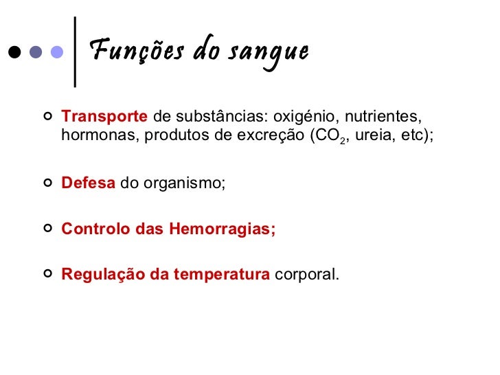2. 2. Funções do sangue <ul><li>Transporte de substâncias: oxigénio, nutrientes, hormonas, produtos de excreção (CO 2 , ureia, etc); </li></ul><ul><li>Defesa do organismo; </li></ul><ul><li>Controlo das Hemorragias; </li></ul><ul><li>Regulação da temperatura corporal. </li></ul>