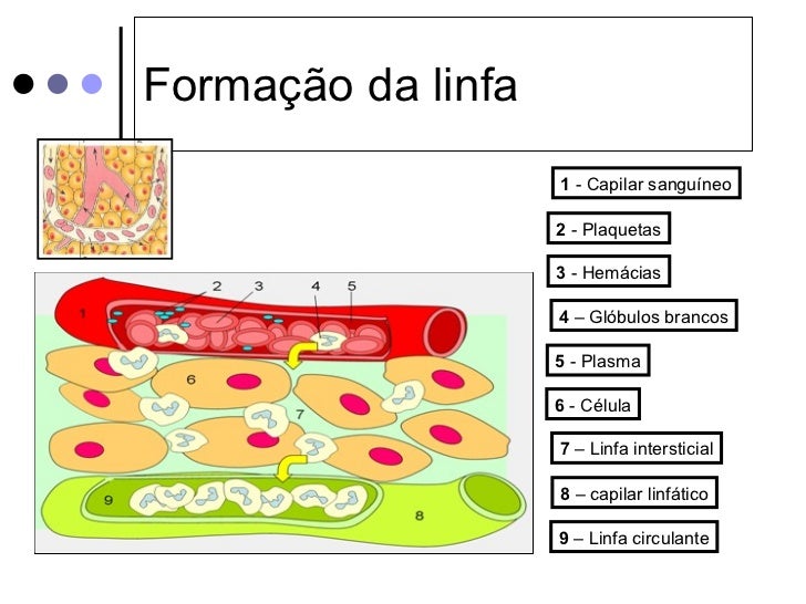 20. 20. Formação da linfa 1 - Capilar sanguíneo 2 - Plaquetas 3 - Hemácias 4 – Glóbulos brancos 5 - Plasma 6 - Célula 7 – Linfa intersticial 8 – capilar linfático 9 – Linfa circulante