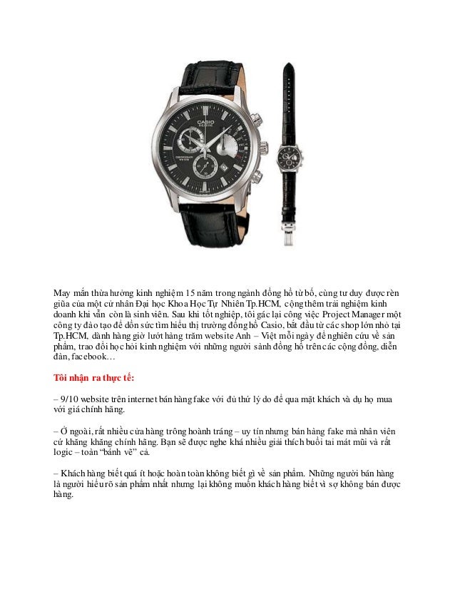 2. 2. May mắn thừa hưởng kinh nghiệm 15 năm trongngành đồng hồ từ bố, cùng tư duy được rèn giũa của một cử nhân Đại học Khoa Học Tự Nhiên Tp.HCM, cộngthêm trải nghiệm kinh doanh khi vẫn cònlà sinh viên. Sau khi tốt nghiệp, tôi gác lại công việc Project Manager một công ty đào tạo để dồn sức tìm hiểu thị trường đồnghồ Casio, bắt đầu từ các shoplớn nhỏ tại Tp.HCM, dành hàng giờ lướt hàng trăm website Anh – Việt mỗi ngày để nghiên cứu về sản phẩm, trao đổi học hỏi kinh nghiệm với những người sànhđồng hồ trêncác cộngđồng, diễn đàn, facebook… Tôi nhận rathực tế: – 9/10 website trêninternet bánhàngfake với đủ thứ lý do để qua mặt khách và dụ họ mua với giá chính hãng. – Ở ngoài, rất nhiều cửa hàng trônghoành tráng – uy tínnhưng bán hàng fake mà nhân viên cứ khăng khăng chính hãng. Bạn sẽ được nghe khá nhiều giải thích buồi tai mát mũi và rất logic – toàn“bánh vẽ” cả. – Kháchhàng biết quá ít hoặc hoàn toànkhông biết gì về sản phẩm. Những người bán hàng là người hiểurõ sản phẩm nhất nhưng lại không muốn khách hàng biết vì sợ không bán được hàng.