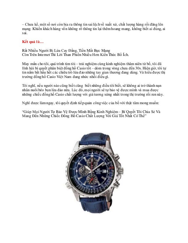 3. 3. – Chưa kể, một số nơi cònbịa ra thông tin sai lệchvề xuất xứ, chất lượng hàng rồi đăng lên mạng. Khiến khách hàng vốn không rõ thông tin lại thêm hoang mang, không biết ai đúng, ai sai. Kết quả là… Rất Nhiều Người Bị Lừa Cay Đắng, Tiền Mất Bực Mang Còn Trên Internet Thì Lời Than PhiềnNhiều Hơn KiếnThức Bổ Ích. May mắn cho tôi, quá trình tim tòi – trải nghiệm cùng kinh nghiệm thâm niên từ bố, tôi đã lĩnh hội bí quyết phân biệt đồnghồ Casio tốt – dỏm trong vòng chưa đến30s. Hiệngiờ, tôi tự tin nắm bắt hầu hết các chiêutrò lừa đảo những tay gian thương đang dùng. Và hiểu được thị trường đồnghồ Casio Việt Nam đang nhức nhối điềugì. Tôi nghĩ, nếu người nào cũng biết cũng biết những điềutôi biết, sẽ không ai trở thành nạn nhân nuôi béo bọn lừa đảo nữa. Lúc đó, mọi người sẽ tự bảo vệ được mình và mua được những chiếc đồnghồ Casio chất lượng với giá tương xứng nhất trongthị trường rối rennày. Nghĩ được làm ngay, tôi quyết định tiếpquản côngviệc của bố với thật tâm mong muốn: “Giúp Mọi Người Tự Bảo Vệ Được Mình Bằng Kinh Nghiệm – Bí Quyết Tôi Chia Sẻ Và Mang Đến Những Chiếc Đồng Hồ Casio Chất Lượng Với Giá Tốt Nhất Có Thể”