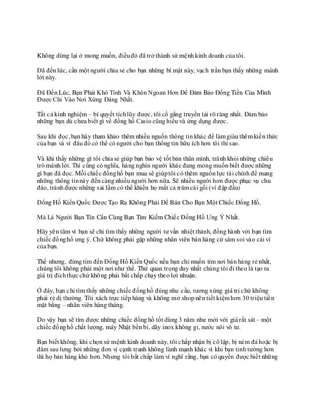 4. 4. Không dừng lại ở mong muốn, điềuđó đã trở thành sứ mệnh kinh doanh của tôi. Đã đếnlúc, cần một người chia sẻ cho bạn những bí mật này, vạch trần bạn thấy những mánh lới này. Đã Đến Lúc, Bạn Phải Khó Tính Và Khôn Ngoan Hơn Để Đảm Bảo Đồng Tiền Của Mình Được Chi Vào Nơi Xứng Đáng Nhất. Tất cả kinh nghiệm – bí quyết tíchlũy được, tôi cố gắng truyền tải rõ ràng nhất. Đảm bảo những bạn dù chưa biết gì về đồng hồ Casio cũng hiểu và ứng dụng được. Sau khi đọc, bạn hãy tham khảo thêm nhiều nguồn thông tin khác để làm giàu thêm kiến thức của bạn và vì đâuđó có thể có người cho bạn thông tin hữu íchhơn tôi thì sao. Và khi thấy những gì tôi chiasẻ giúp bạn bảo vệ tốt bản thân mình, tránh khỏi những chiêu trò mánh lới. Thì cũng có nghĩa, hàng nghìn người khác đang mong muốn biết được những gì bạn đã đọc. Mỗi chiếc đồnghồ bạn mua sẽ giúptôi có thêm nguồn lực tài chính để mang những thông tinnày đếncàng nhiều người hơn nữa. Sẽ nhiều người hơn được phục vụ chu đáo, tránhđược những sai lầm có thể khiến họ mất cả trăm cái gối (vì đập đầu) Đồng Hồ KiếnQuốc Được Tạo Ra Không Phải Để Bán Cho Bạn Một Chiếc Đồng Hồ, Mà Là Người Bạn Tín Cẩn Cùng Bạn Tìm Kiếm Chiếc Đồng Hồ Ưng Ý Nhất. Hãy yên tâm vì bạn sẽ chỉ tìm thấy những người tư vấn nhiệt thành, đồng hành với bạn tìm chiếc đồnghồ ưng ý. Chứ không phải gặp những nhân viên bán hàng cứ săm soi vào cái ví của bạn. Thế nhưng, đừng tìm đến Đồng Hồ Kiến Quốc nếu bạn chỉ muốn tìm nơi bán hàng rẻ nhất, chúng tôi không phải một nơi như thế. Thứ quan trọng duy nhất chúng tôi đi theo là tạo ra giá trị đíchthực chứ không phải bất chấp chạy theo lợi nhuận. Ở đây, bạn chỉ tìm thấy những chiếc đồnghồ đúngnhu cầu, tương xứng giá trị chứ không phải rẻ dị thường. Tôi xách trực tiếphàng và không mở shop nên tiết kiệm hơn 30 triệutiền mặt bằng – nhân viên hàng tháng. Do vậy bạn sẽ tìm được những chiếc đồnghồ tốt dùng 3 năm như mới với giá rất sát – một chiếc đồnghồ chất lượng, máy Nhật bền bỉ, dây inox không gỉ, nước nôi vô tư. Bạn biết không, khi chọnsứ mệnh kinh doanh này, tôi chấp nhận bị cô lập, bị ném đá hoặc bị đâm sau lưng bởi những đơn vị cạnh tranh không lành mạnh khác vì khi bạn tinh tường hơn thì họ bán hàng khó hơn. Nhưng tôi bất chấp làm vì nghĩ rằng, bạn có quyền được biết những