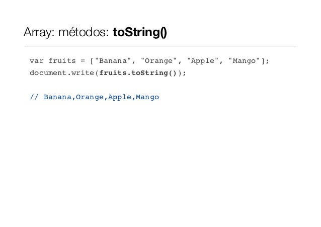 Array: métodos: toString() var fruits = ["Banana", "Orange", "Apple", "Mango"]; document.write(fruits.toString()); // Bana...