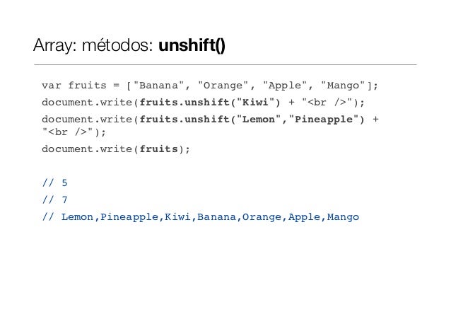 Array: métodos: unshift() var fruits = ["Banana", "Orange", "Apple", "Mango"]; document.write(fruits.unshift("Kiwi") + "<b...