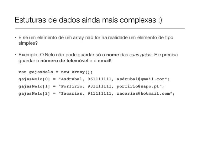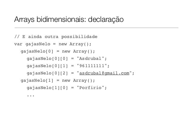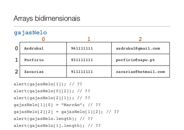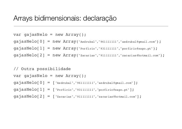 18. 18. Arrays bidimensionais: declaraçãovar gajasNelo = new Array();gajasNelo[0] = new Array("Asdrubal","961111111","asdrubal@gmail.com");gajasNelo[1] = new Array("Porfirio","931111111","porfirio@sapo.pt");gajasNelo[2] = new Array("Zacarias","911111111","zacarias@hotmail.com");// Outra possibilidadevar gajasNelo = new Array();gajasNelo[0] = ["Asdrubal","961111111","asdrubal@gmail.com"];gajasNelo[1] = ["Porfirio","931111111","porfirio@sapo.pt"];gajasNelo[2] = ["Zacarias","911111111","zacarias@hotmail.com"];
