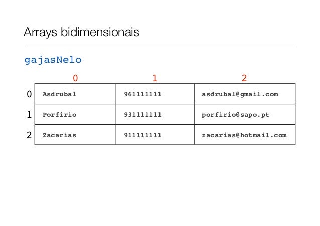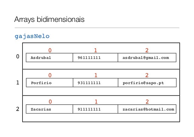 16. 16. Arrays bidimensionaisgajasNelo 0 1 20 Asdrubal 961111111 asdrubal@gmail.com1 Porfirio 931111111 porfirio@sapo.pt2 Zacarias 911111111 zacarias@hotmail.com