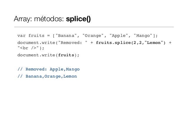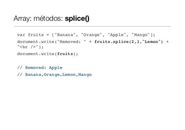 Array: métodos: splice() var fruits = ["Banana", "Orange", "Apple", "Mango"]; document.write("Removed: " + fruits.splice(2...