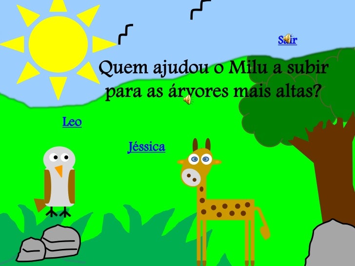 29. 29. Sair Quem ajudou o Milu a subir para as árvores mais altas?Leo Jéssica
