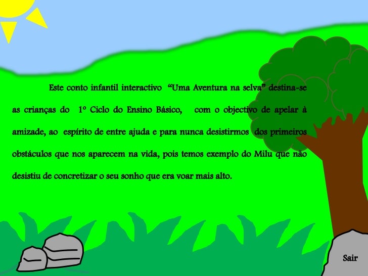 31. 31. Este conto infantil interactivo “Uma Aventura na selva” destina-seas crianças do 1º Ciclo do Ensino Básico, com o objectivo de apelar àamizade, ao espírito de entre ajuda e para nunca desistirmos dos primeirosobstáculos que nos aparecem na vida, pois temos exemplo do Milu que nãodesistiu de concretizar o seu sonho que era voar mais alto. Sair
