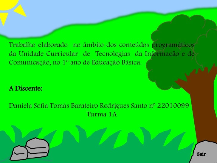 32. 32. Trabalho elaborado no âmbito dos conteúdos programáticosda Unidade Curricular de Tecnologias da Informação e deComunicação, no 1º ano de Educação Básica.A Discente:Daniela Sofia Tomás Barateiro Rodrigues Santo nº 22010099 Turma 1A Sair