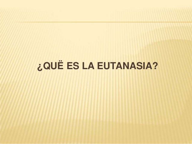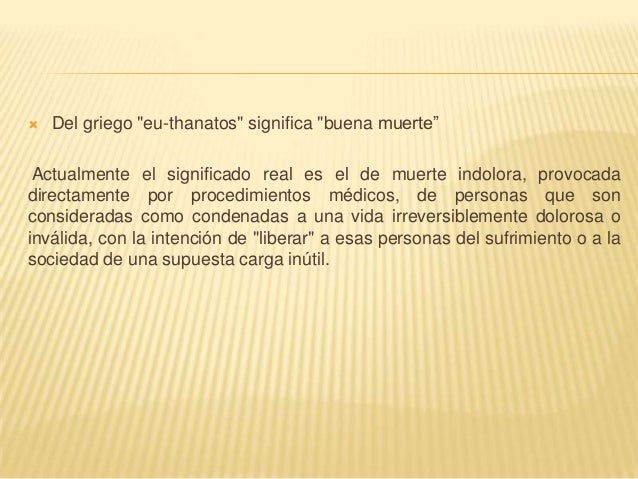 3. 3.  Del griego "eu-thanatos" significa "buena muerte” Actualmente el significado real es el de muerte indolora, provocada directamente por procedimientos médicos, de personas que son consideradas como condenadas a una vida irreversiblemente dolorosa o inválida, con la intención de "liberar" a esas personas del sufrimiento o a la sociedad de una supuesta carga inútil.