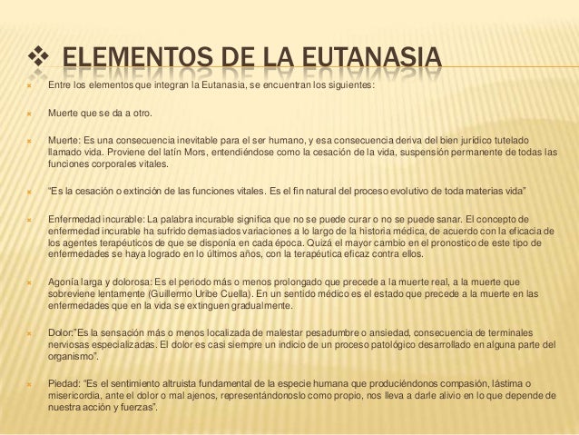 5. 5.  ELEMENTOS DE LA EUTANASIA  Entre los elementos que integran la Eutanasia, se encuentran los siguientes:  Muerte que se da a otro.  Muerte: Es una consecuencia inevitable para el ser humano, y esa consecuencia deriva del bien jurídico tutelado llamado vida. Proviene del latín Mors, entendiéndose como la cesación de la vida, suspensión permanente de todas las funciones corporales vitales.  “Es la cesación o extinción de las funciones vitales. Es el fin natural del proceso evolutivo de toda materias vida”  Enfermedad incurable: La palabra incurable significa que no se puede curar o no se puede sanar. El concepto de enfermedad incurable ha sufrido demasiados variaciones a lo largo de la historia médica, de acuerdo con la eficacia de los agentes terapéuticos de que se disponía en cada época. Quizá el mayor cambio en el pronostico de este tipo de enfermedades se haya logrado en lo últimos años, con la terapéutica eficaz contra ellos.  Agonía larga y dolorosa: Es el periodo más o menos prolongado que precede a la muerte real, a la muerte que sobreviene lentamente (Guillermo Uribe Cuella). En un sentido médico es el estado que precede a la muerte en las enfermedades que en la vida se extinguen gradualmente.  Dolor:”Es la sensación más o menos localizada de malestar pesadumbre o ansiedad, consecuencia de terminales nerviosas especializadas. El dolor es casi siempre un indicio de un proceso patológico desarrollado en alguna parte del organismo”.  Piedad: “Es el sentimiento altruista fundamental de la especie humana que produciéndonos compasión, lástima o misericordia, ante el dolor o mal ajenos, representándonoslo como propio, nos lleva a darle alivio en lo que depende de nuestra acción y fuerzas”.
