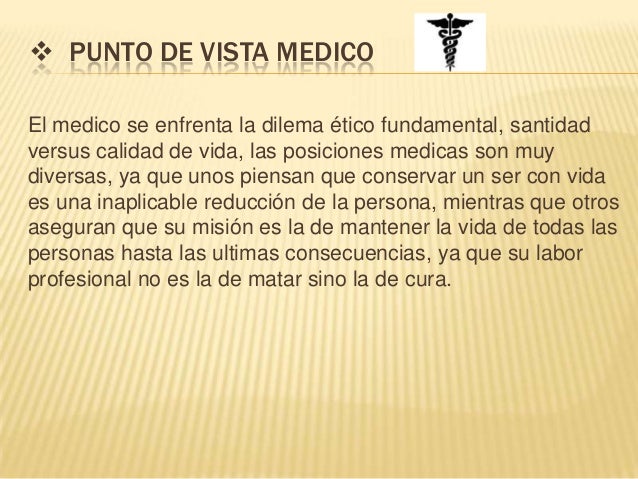 6. 6.  PUNTO DE VISTA MEDICO El medico se enfrenta la dilema ético fundamental, santidad versus calidad de vida, las posiciones medicas son muy diversas, ya que unos piensan que conservar un ser con vida es una inaplicable reducción de la persona, mientras que otros aseguran que su misión es la de mantener la vida de todas las personas hasta las ultimas consecuencias, ya que su labor profesional no es la de matar sino la de cura.