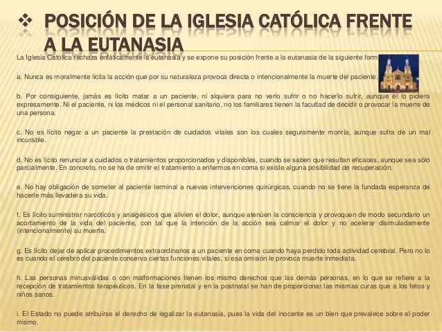8. 8.  POSICIÓN DE LA IGLESIA CATÓLICA FRENTE A LA EUTANASIA La Iglesia Católica rechaza enfáticamente la eutanasia y se expone su posición frente a la eutanasia de la siguiente forma: a. Nunca es moralmente lícita la acción que por su naturaleza provoca directa o intencionalmente la muerte del paciente. b. Por consiguiente, jamás es lícito matar a un paciente, ni siquiera para no verlo sufrir o no hacerlo sufrir, aunque él lo pidiera expresamente. Ni el paciente, ni los médicos ni el personal sanitario, no los familiares tienen la facultad de decidir o provocar la muerte de una persona. c. No es lícito negar a un paciente la prestación de cuidados vitales son los cuales seguramente moriría, aunque sufra de un mal incurable. d. No es lícito renunciar a cuidados o tratamientos proporcionados y disponibles, cuando se saben que resultan eficaces, aunque sea sólo parcialmente. En concreto, no se ha de omitir el tratamiento a enfermos en coma si existe alguna posibilidad de recuperación. e. No hay obligación de someter al paciente terminal a nuevas intervenciones quirúrgicas, cuando no se tiene la fundada esperanza de hacerle más llevadera su vida. f. Es lícito suministrar narcóticos y analgésicos que alivien el dolor, aunque atenúen la consciencia y provoquen de modo secundario un acortamiento de la vida del paciente, con tal que la intención de la acción sea calmar el dolor y no acelerar disimuladamente (intencionalmente) su muerte. g. Es lícito dejar de aplicar procedimientos extraordinarios a un paciente en coma cuando haya perdido toda actividad cerebral. Pero no lo es cuando el cerebro del paciente conserva ciertas funciones vitales, si esa omisión le provoca muerte inmediata. h. Las personas minusválidas o con malformaciones tienen los mismo derechos que las demás personas, en lo que se refiere a la recepción de tratamientos terapéuticos. En la fase prenatal y en la postnatal se han de proporcionar las mismas curas que a los fetos y niños sanos. i. El Estado no puede atribuirse el derecho de legalizar la eutanasia, pues la vida del inocente es un bien que prevalece sobre el poder mismo.
