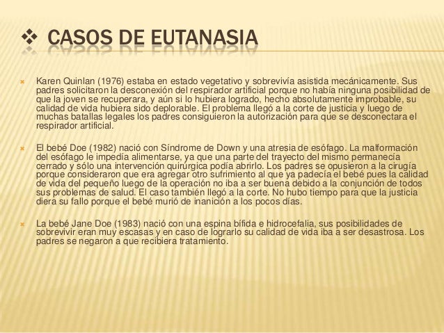 9. 9.  CASOS DE EUTANASIA  Karen Quinlan (1976) estaba en estado vegetativo y sobrevivía asistida mecánicamente. Sus padres solicitaron la desconexión del respirador artificial porque no había ninguna posibilidad de que la joven se recuperara, y aún si lo hubiera logrado, hecho absolutamente improbable, su calidad de vida hubiera sido deplorable. El problema llegó a la corte de justicia y luego de muchas batallas legales los padres consiguieron la autorización para que se desconectara el respirador artificial.  El bebé Doe (1982) nació con Síndrome de Down y una atresia de esófago. La malformación del esófago le impedía alimentarse, ya que una parte del trayecto del mismo permanecía cerrado y sólo una intervención quirúrgica podía abrirlo. Los padres se opusieron a la cirugía porque consideraron que era agregar otro sufrimiento al que ya padecía el bebé pues la calidad de vida del pequeño luego de la operación no iba a ser buena debido a la conjunción de todos sus problemas de salud. El caso también llegó a la corte. No hubo tiempo para que la justicia diera su fallo porque el bebé murió de inanición a los pocos días.  La bebé Jane Doe (1983) nació con una espina bífida e hidrocefalia, sus posibilidades de sobrevivir eran muy escasas y en caso de lograrlo su calidad de vida iba a ser desastrosa. Los padres se negaron a que recibiera tratamiento.
