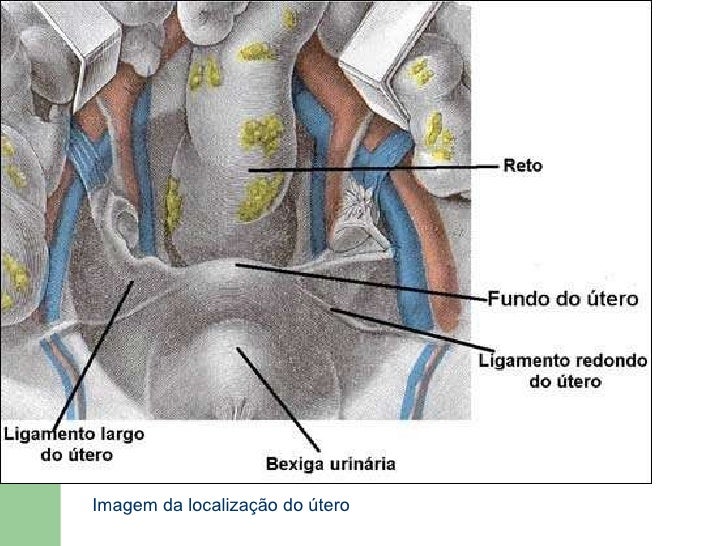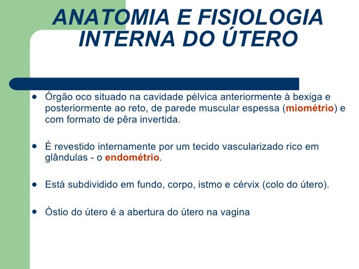 9. 10. ANATOMIA E FISIOLOGIA INTERNA DO ÚTERO <ul><li>Órgão oco situado na cavidade pélvica anteriormente à bexiga e posteriormente ao reto, de parede muscular espessa ( miométrio ) e com formato de pêra invertida.  </li></ul><ul><li>É revestido internamente por um tecido vascularizado rico em glândulas - o endométrio .  </li></ul><ul><li>Está subdividido em fundo, corpo, istmo e cérvix (colo do útero). </li></ul><ul><li>Óstio do útero é a abertura do útero na vagina </li></ul>