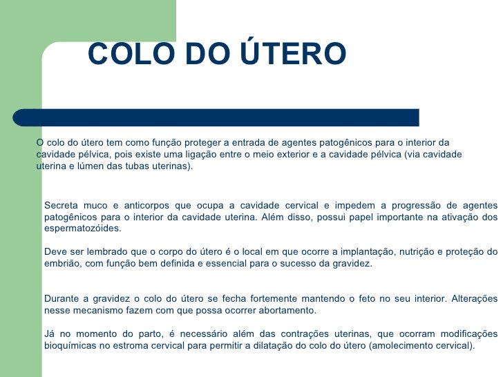 11. 12. Secreta muco e anticorpos que ocupa a cavidade cervical e impedem a progressão de agentes patogênicos para o interior da cavidade uterina. Além disso, possui papel importante na ativação dos espermatozóides. Deve ser lembrado que o corpo do útero é o local em que ocorre a implantação, nutrição e proteção do embrião, com função bem definida e essencial para o sucesso da gravidez. Durante a gravidez o colo do útero se fecha fortemente mantendo o feto no seu interior. Alterações nesse mecanismo fazem com que possa ocorrer abortamento. Já no momento do parto, é necessário além das contrações uterinas, que ocorram modificações bioquímicas no estroma cervical para permitir a dilatação do colo do útero (amolecimento cervical). O colo do útero tem como função proteger a entrada de agentes patogênicos para o interior da cavidade pélvica, pois existe uma ligação entre o meio exterior e a cavidade pélvica (via cavidade uterina e lúmen das tubas uterinas). COLO DO ÚTERO