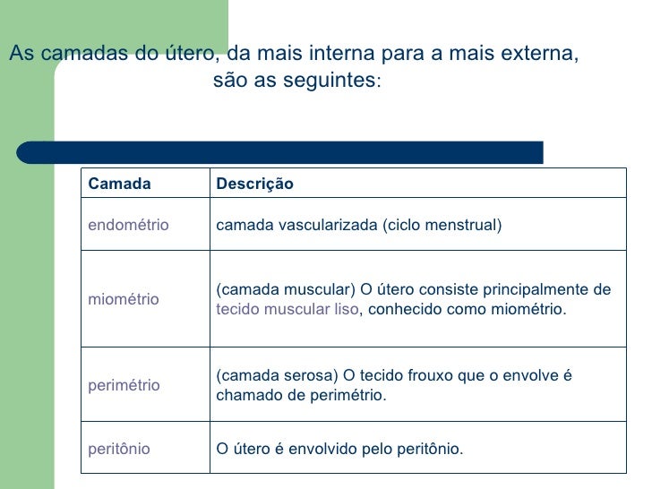 13. 15. As camadas do útero, da mais interna para a mais externa, são as seguintes : Camada Descrição endométrio camada vascularizada (ciclo menstrual) miométrio (camada muscular) O útero consiste principalmente de tecido muscular liso , conhecido como miométrio. perimétrio (camada serosa) O tecido frouxo que o envolve é chamado de perimétrio. peritônio O útero é envolvido pelo peritônio.