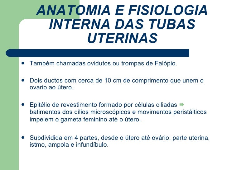 14. 17. ANATOMIA E FISIOLOGIA INTERNA DAS TUBAS UTERINAS <ul><li>Também chamadas ovidutos ou trompas de Falópio. </li></ul><ul><li>Dois ductos com cerca de 10 cm de comprimento que unem o ovário ao útero. </li></ul><ul><li>Epitélio de revestimento formado por células ciliadas  batimentos dos cílios microscópicos e movimentos peristálticos impelem o gameta feminino até o útero.    </li></ul><ul><li>Subdividida em 4 partes, desde o útero até ovário: parte uterina, istmo, ampola e infundíbulo. </li></ul>