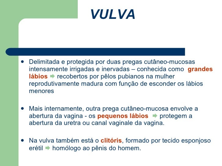 3. 3. VULVA <ul><li>Delimitada e protegida por duas pregas cutâneo-mucosas intensamente irrigadas e inervadas – conhecida como grandes lábios  recobertos por pêlos pubianos na mulher reprodutivamente madura com função de esconder os lábios menores </li></ul><ul><li>Mais internamente, outra prega cutâneo-mucosa envolve a abertura da vagina - os pequenos lábios    protegem a abertura da uretra ou canal vaginale da vagina. </li></ul><ul><li>Na vulva também está o clitóris , formado por tecido esponjoso erétil  homólogo ao pênis do homem.  </li></ul>