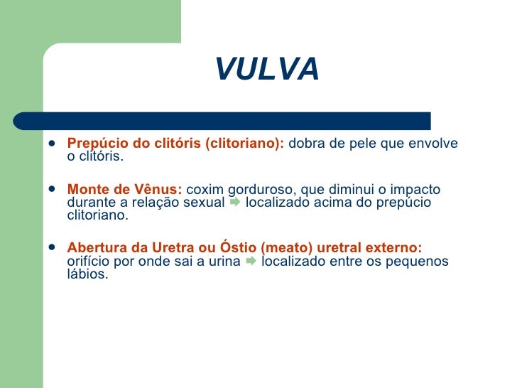 4. 4. <ul><li>Prepúcio do clitóris (clitoriano): dobra de pele que envolve o clitóris. </li></ul><ul><li>Monte de Vênus: coxim gorduroso, que diminui o impacto durante a relação sexual  localizado acima do prepúcio clitoriano. </li></ul><ul><li>Abertura da Uretra ou Óstio (meato) uretral externo: orifício por onde sai a urina  localizado entre os pequenos lábios. </li></ul>VULVA