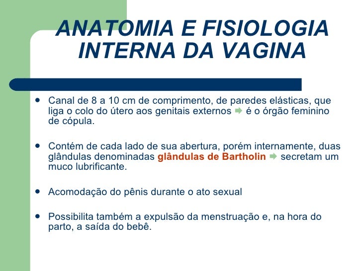 7. 8. ANATOMIA E FISIOLOGIA INTERNA DA VAGINA <ul><li>Canal de 8 a 10 cm de comprimento, de paredes elásticas, que liga o colo do útero aos genitais externos  é o órgão feminino de cópula. </li></ul><ul><li>Contém de cada lado de sua abertura, porém internamente, duas glândulas denominadas glândulas de Bartholin  secretam um muco lubrificante. </li></ul><ul><li>Acomodação do pênis durante o ato sexual </li></ul><ul><li>Possibilita também a expulsão da menstruação e, na hora do parto, a saída do bebê. </li></ul>