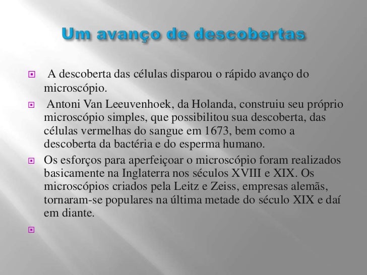 3. 3. Um avanço de descobertas<br /> A descoberta das células disparou o rápido avanço do microscópio.<br /> Antoni Van Leeuvenhoek, da Holanda, construiu seu próprio microscópio simples, que possibilitou sua descoberta, das células vermelhas do sangue em 1673, bem como a descoberta da bactéria e do esperma humano.<br />Os esforços para aperfeiçoar o microscópio foram realizados basicamente na Inglaterra nos séculos XVIII e XIX. Os microscópios criados pela Leitz e Zeiss, empresas alemãs, tornaram-se populares na última metade do século XIX e daí em diante.<br /> <br />