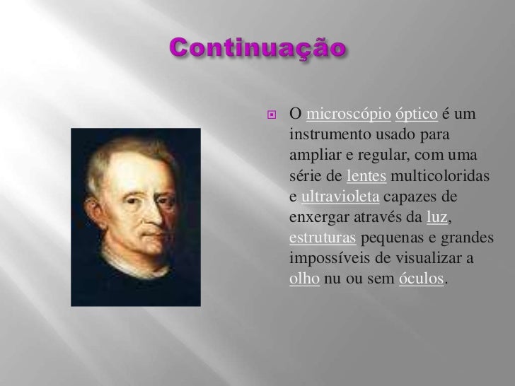 4. 4. Continuação<br />O microscópioópticoé um instrumento usado para ampliar e regular, com uma série de lentes multicoloridas e ultravioleta capazes de enxergar através da luz, estruturas pequenas e grandes impossíveis de visualizar a olho nu ou sem óculos.<br />