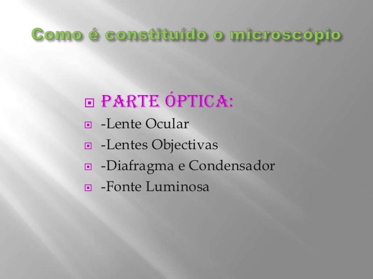 5. 5. Como é constituído o microscópio<br />Parte Óptica:<br />-Lente Ocular<br />-Lentes Objectivas<br />-Diafragma e Condensador<br />-Fonte Luminosa<br />