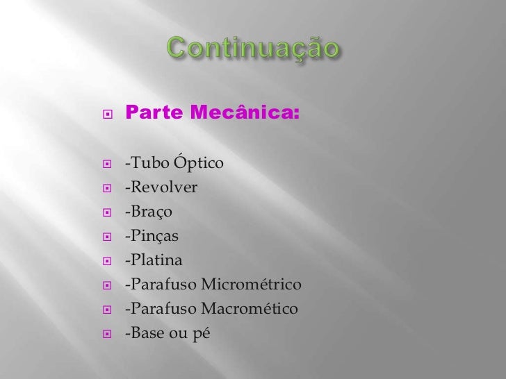 6. 6. Continuação<br />Parte Mecânica:<br />-Tubo Óptico<br />-Revolver<br />-Braço<br />-Pinças<br />-Platina<br />-Parafuso Micrométrico<br />-Parafuso Macromético<br />-Base ou pé<br />