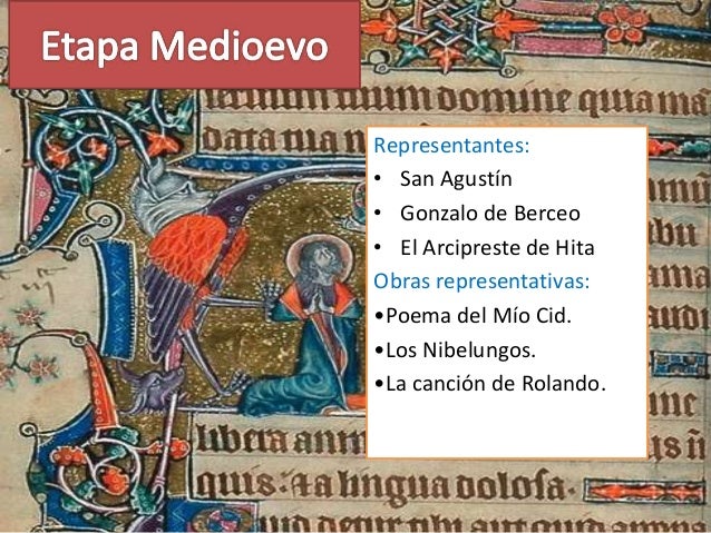 10. 10. Representantes:• San Agustín• Gonzalo de Berceo• El Arcipreste de HitaObras representativas:•Poema del Mío Cid.•Los Nibelungos.•La canción de Rolando.