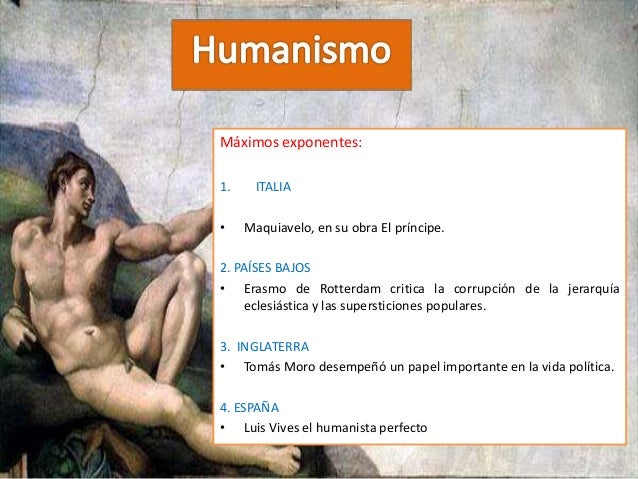 13. 13. Máximos exponentes:1. ITALIA• Maquiavelo, en su obra El príncipe.2. PAÍSES BAJOS• Erasmo de Rotterdam critica la corrupción de la jerarquía eclesiástica y las supersticiones populares.3. INGLATERRA• Tomás Moro desempeñó un papel importante en la vida política.4. ESPAÑA• Luis Vives el humanista perfecto