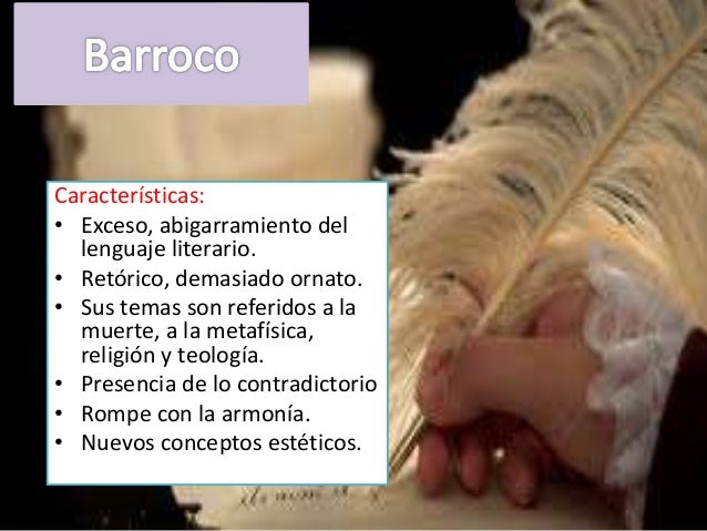 18. 18. Características:• Exceso, abigarramiento del lenguaje literario.• Retórico, demasiado ornato.• Sus temas son referidos a la muerte, a la metafísica, religión y teología.• Presencia de lo contradictorio• Rompe con la armonía.• Nuevos conceptos estéticos.