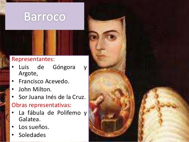 19. 19. Representantes:• Luis de Góngora y Argote,• Francisco Acevedo.• John Milton.• Sor Juana Inés de la Cruz.Obras representativas:• La fábula de Polifemo y Galatea.• Los sueños.• Soledades
