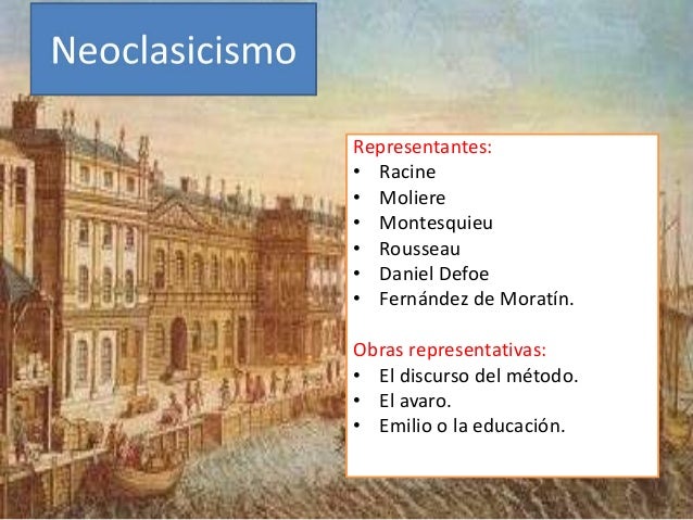 22. 22. Representantes:• Racine• Moliere• Montesquieu• Rousseau• Daniel Defoe• Fernández de Moratín.Obras representativas:• El discurso del método.• El avaro.• Emilio o la educación.