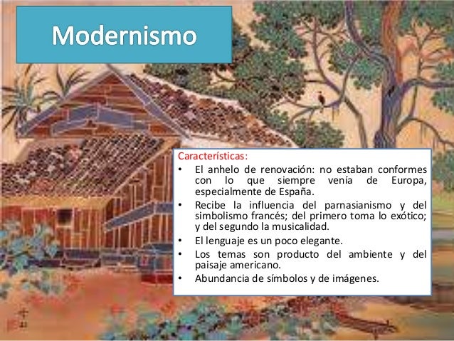 36. 36. Características:• El anhelo de renovación: no estaban conformes con lo que siempre venía de Europa, especialmente de España.• Recibe la influencia del parnasianismo y del simbolismo francés; del primero toma lo exótico; y del segundo la musicalidad.• El lenguaje es un poco elegante.• Los temas son producto del ambiente y del paisaje americano.• Abundancia de símbolos y de imágenes.