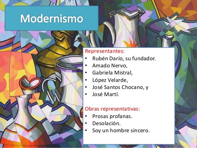 37. 37. Representantes:• Rubén Darío, su fundador.• Amado Nervo,• Gabriela Mistral,• López Velarde,• José Santos Chocano, y• José Martí.Obras representativas:• Prosas profanas.• Desolación.• Soy un hombre sincero.