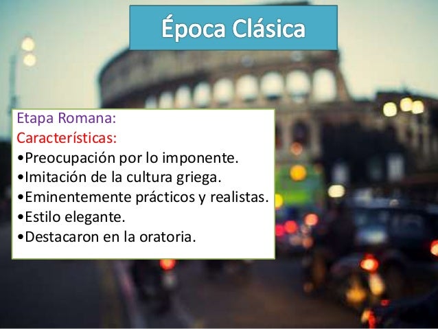 6. 6. Etapa Romana:Características:•Preocupación por lo imponente.•Imitación de la cultura griega.•Eminentemente prácticos y realistas.•Estilo elegante.•Destacaron en la oratoria.