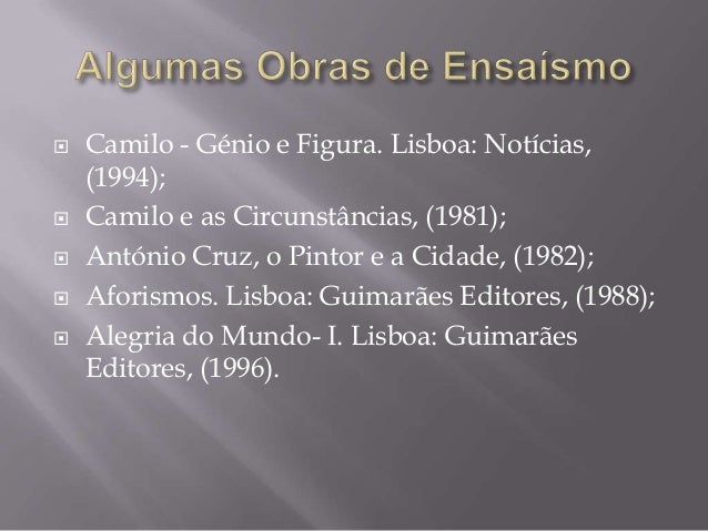 10. 10.  Camilo - Génio e Figura. Lisboa: Notícias, (1994); Camilo e as Circunstâncias, (1981); António Cruz, o Pintor e a Cidade, (1982); Aforismos. Lisboa: Guimarães Editores, (1988); Alegria do Mundo- I. Lisboa: Guimarães Editores, (1996).