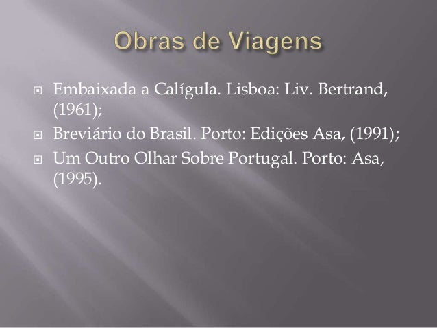 12. 12.  Embaixada a Calígula. Lisboa: Liv. Bertrand, (1961); Breviário do Brasil. Porto: Edições Asa, (1991); Um Outro Olhar Sobre Portugal. Porto: Asa, (1995).