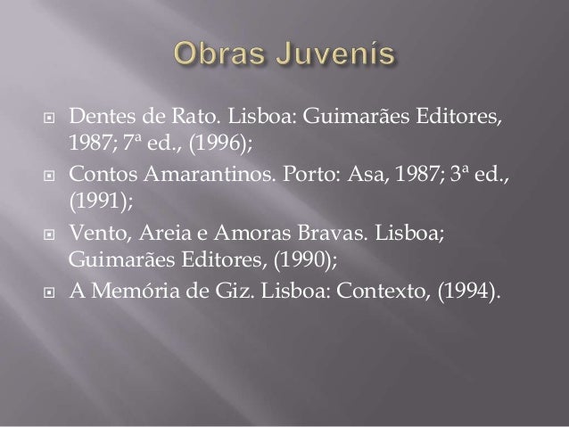 14. 14.  Dentes de Rato. Lisboa: Guimarães Editores, 1987; 7ª ed., (1996); Contos Amarantinos. Porto: Asa, 1987; 3ª ed., (1991); Vento, Areia e Amoras Bravas. Lisboa; Guimarães Editores, (1990); A Memória de Giz. Lisboa: Contexto, (1994).
