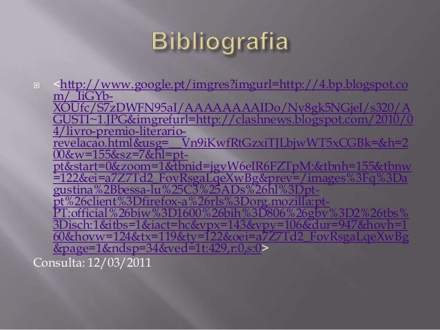 15. 15.  <http://www.google.pt/imgres?imgurl=http://4.bp.blogspot.co m/_IiGYb- XOUfc/S7zDWFN95aI/AAAAAAAAIDo/Nv8gk5NGjeI/s320/A GUSTI~1.JPG&imgrefurl=http://clashnews.blogspot.com/2010/0 4/livro-premio-literario- revelacao.html&usg=__Vn9iKwfRtGzxiTJLbjwWT5xCGBk=&h=2 00&w=155&sz=7&hl=pt- pt&start=0&zoom=1&tbnid=jgvW6eIR6FZTpM:&tbnh=155&tbnw =122&ei=a7Z7Td2_FovRsgaLqeXwBg&prev=/images%3Fq%3Da gustina%2Bbessa-lu%25C3%25ADs%26hl%3Dpt- pt%26client%3Dfirefox-a%26rls%3Dorg.mozilla:pt- PT:official%26biw%3D1600%26bih%3D806%26gbv%3D2%26tbs% 3Disch:1&itbs=1&iact=hc&vpx=143&vpy=106&dur=947&hovh=1 60&hovw=124&tx=119&ty=122&oei=a7Z7Td2_FovRsgaLqeXwBg &page=1&ndsp=34&ved=1t:429,r:0,s:0>Consulta: 12/03/2011