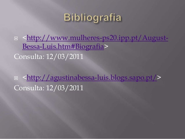 16. 16.  <http://www.mulheres-ps20.ipp.pt/August- Bessa-Luis.htm#Biografia>Consulta: 12/03/2011 <http://agustinabessa-luis.blogs.sapo.pt/>Consulta: 12/03/2011