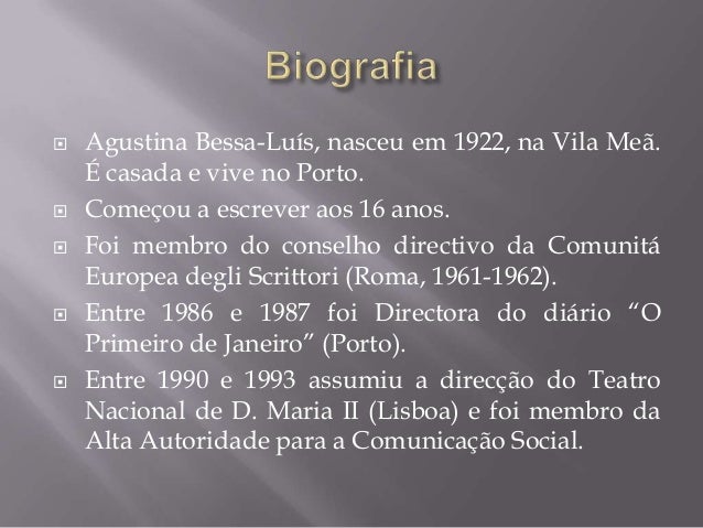 2. 2.  Agustina Bessa-Luís, nasceu em 1922, na Vila Meã. É casada e vive no Porto. Começou a escrever aos 16 anos. Foi membro do conselho directivo da Comunitá Europea degli Scrittori (Roma, 1961-1962). Entre 1986 e 1987 foi Directora do diário “O Primeiro de Janeiro” (Porto). Entre 1990 e 1993 assumiu a direcção do Teatro Nacional de D. Maria II (Lisboa) e foi membro da Alta Autoridade para a Comunicação Social.
