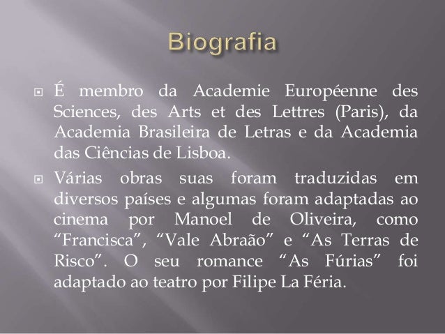 3. 3.  É membro da Academie Européenne des Sciences, des Arts et des Lettres (Paris), da Academia Brasileira de Letras e da Academia das Ciências de Lisboa. Várias obras suas foram traduzidas em diversos países e algumas foram adaptadas ao cinema por Manoel de Oliveira, como “Francisca”, “Vale Abraão” e “As Terras de Risco”. O seu romance “As Fúrias” foi adaptado ao teatro por Filipe La Féria.